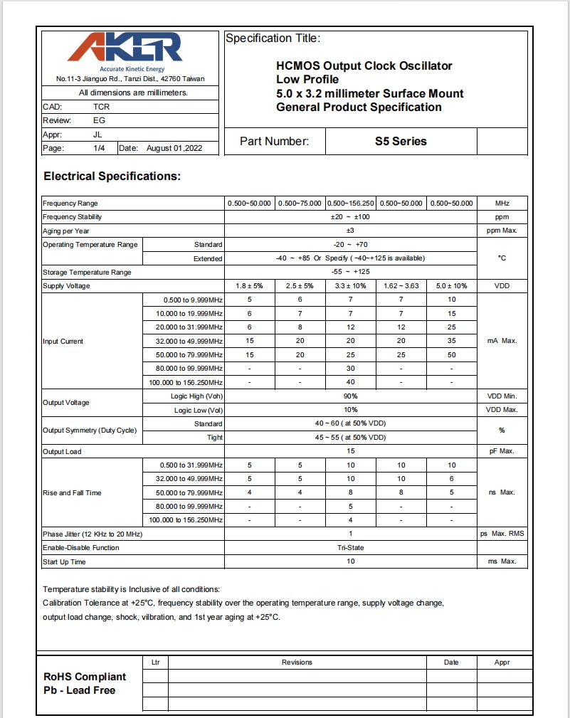 | S53305T-125.000-X-R | Aker Technology Corp | S5 | XO (Standard) | 125 MHz | HCMOS | 3.3V | ±50ppm | -40°C ~ 85°C | 40mA |