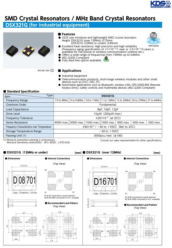 3225尺寸的微型和轻型KDS晶振SMD晶体谐振器.高度(12MHz或以下):0.85mm