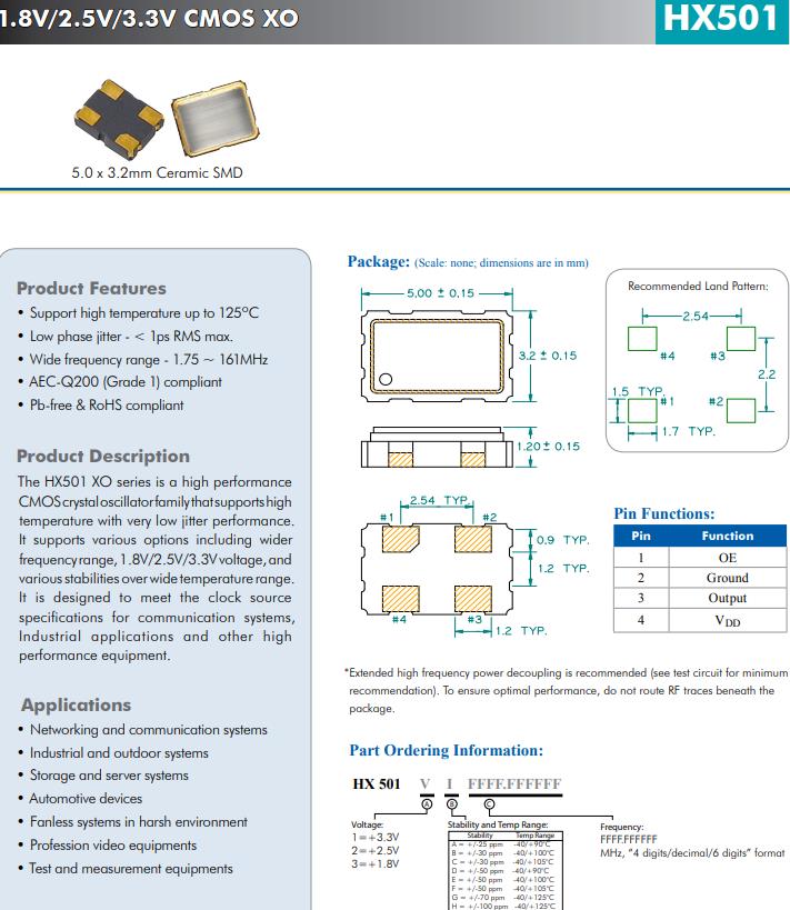 HX501 XO系列是一种高性能CMOS时钟晶体振荡器家族,支持高具有极低抖动性能的温度。它支持各种选项,包括更广泛频率范围,1.8V/2.5V/3.3V电压,和在较宽的温度范围内具有多种稳定性。它是为满足时钟源而设计的通信系统规范,工业应用等较高设备性能。