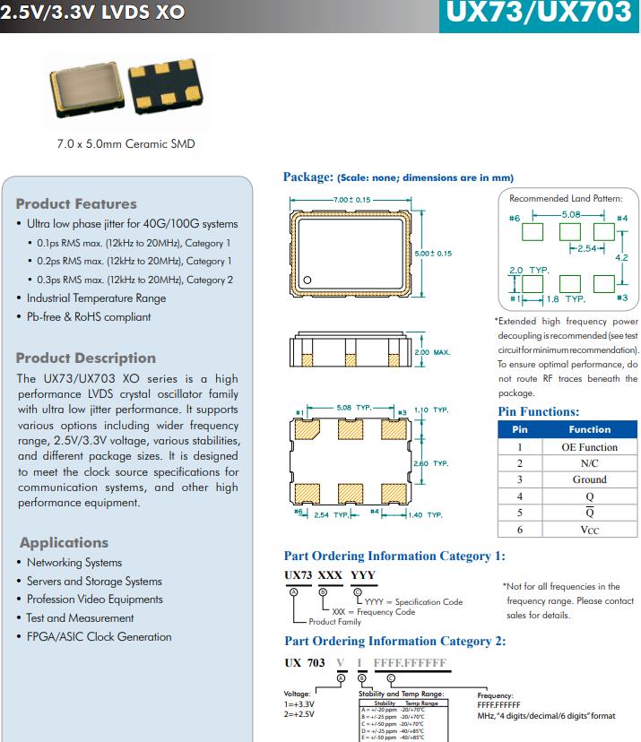 UX73/UX703 XO系列是高性能LVDS时钟晶体振荡器系列具有超低抖动性能。它支持多种选择,包括更广泛的频率2.5V/3.3V电压,各种稳定性,以及不同的包装尺寸。它的目的是的时钟源规格通讯系统等高设备性能。
