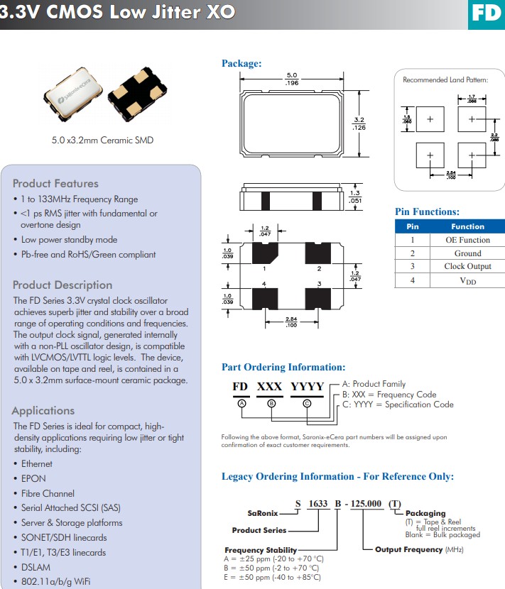 | FD3330026 | Diodes晶振 | SaRonix-eCera™ FD | 33.333MHz | ±50ppm | -40°C ~ 85°C |
