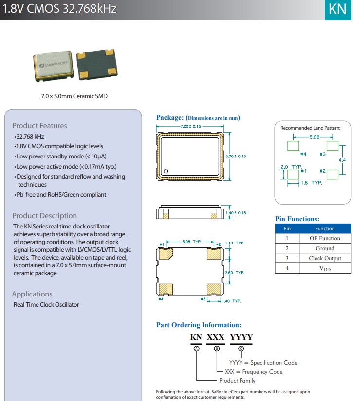 KN系列1.8V小体积尺寸7050mm有源晶振,KN3270034,KN3270026,时钟晶体振荡器,ECERA晶振