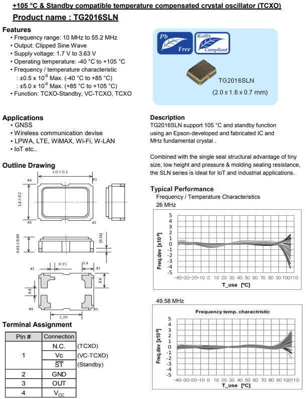 | X1G005731080116 | TG2016SLN | 26.000000MHz | 2.00x1.60x0.61mm | Clippedsinewave | 3.135 to 3.465V | +/-2.0ppm | -40 to +105°C |