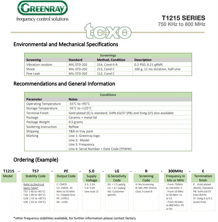 采购:Greenray格林雷晶振,T1215差分晶振,T1215-T57-PE-5.0-LG-B-300MHz-E晶振