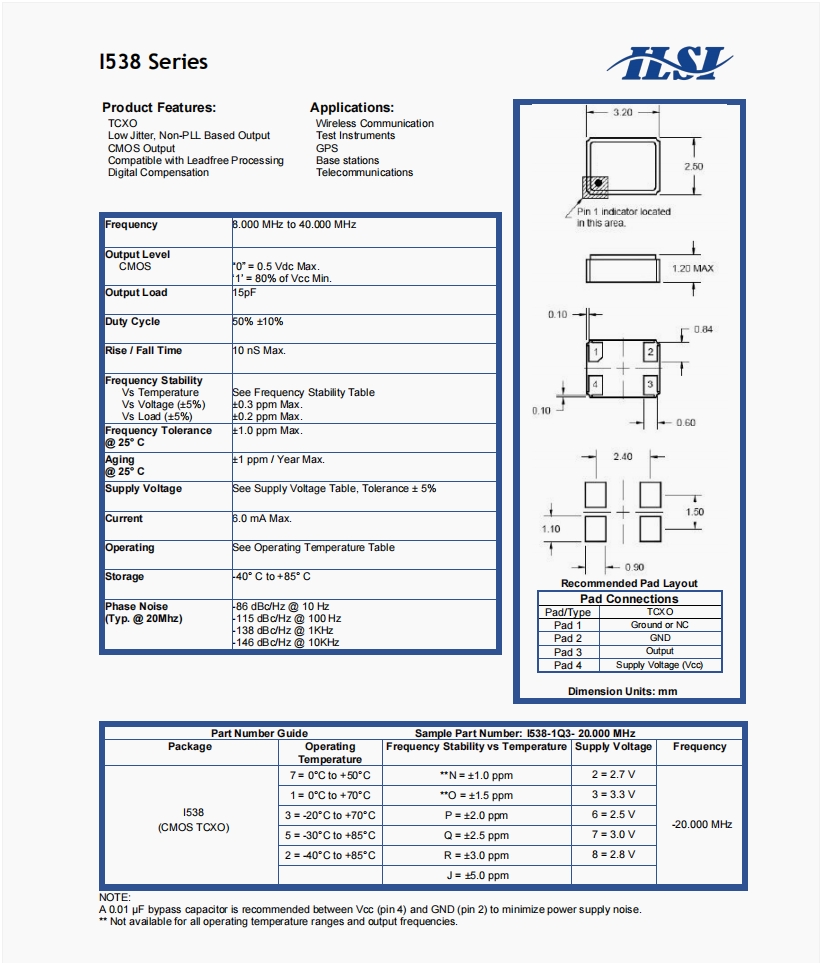 | I538-2P3- 32.000 MHz | ILSI | I538 | TCXO | 3.2mm | 2.5mm | 1.2mm | -40℃ ~ 85℃ | 32 MHz |