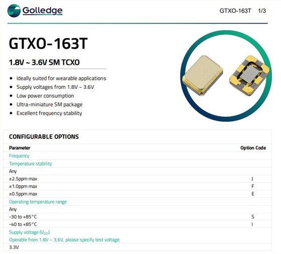我们的最新产品之一Golledge GTXO-163T TCXO采用紧凑的1612封装设计,高度为0.7mm,非常适合空间受限的设计和应用.该TCXO提供多种频率稳定性选项,包括±0.5ppm等严格容差,确保在关键系统中具有可靠的性能.该器件可在1.8V至3.6V的电源电压范围内工作,在不影响性能的情况下提供多功能性.