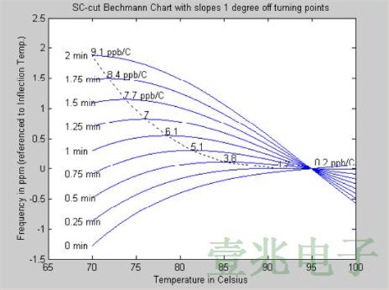 在下图中,显示了每条曲线的局部斜率关闭转折点±1°C,这让OCXO设计师可以看到如果烤箱控制低于±1°C,则预期稳定性AT切割水晶的转折点,如果烤箱可以保持更紧,然后可以实现更严格的稳定性,字母SC代表"压力补偿",由于石英晶体振荡器是各向异性,在AT切割中看到的应力可以减少或通过phi方向的第二次旋转消除,通过计算,21.3°的phi旋转,将不会产生压力诱发频移.