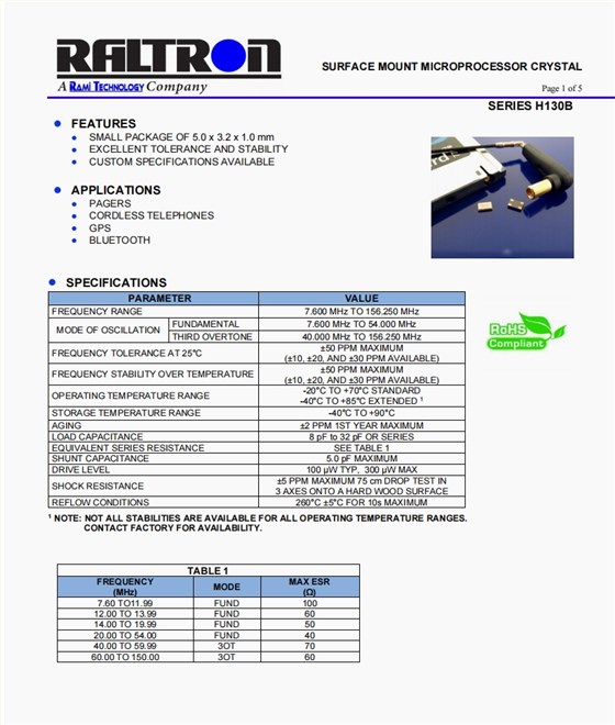 | H130B-18.432-18-EXT-TR | Raltron Electronics | H130B | 18.432 MHz | ±50ppm | 18pF | -40°C ~ 85°C |